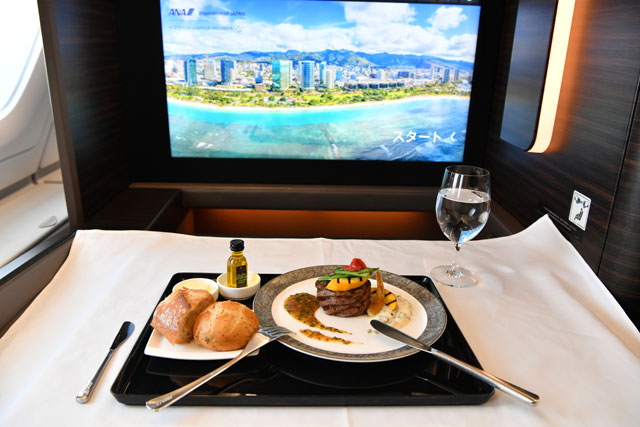 ANAのA380による「レストランFLYING HONU」のファーストクラスで提供された洋食のメインディッシュ=21年6月26日 PHOTO: Tadayuki YOSHIKAWA/Aviation Wire