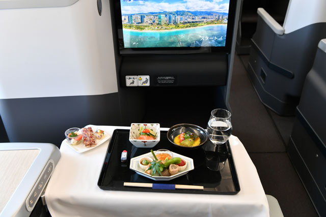 ANAのA380による「レストランFLYING HONU」のビジネスクラスで提供された和食の前菜=21年6月26日 PHOTO: Tadayuki YOSHIKAWA/Aviation Wire