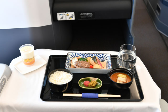 機内食を実機で食べる雰囲気を盛り上げようと、便名はNH2029便と名付けた。ファーストクラス洋食の場合、アミューズ、3種類から選べるアペタイザー、ブレッドセレクション、4種類から選べるメイン、3種類から選べるデザートをコースで提供。和食はアミューズ、先附、前菜、お椀、お造り、炊き合わせ、小鉢、主菜、御飯、デザートを用意した。