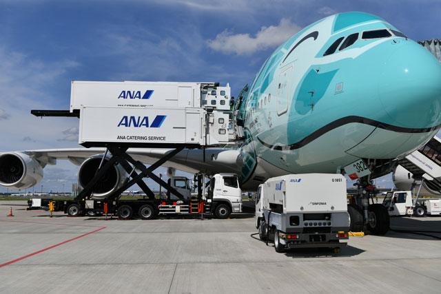 成田空港でANAの「レストランFLYING HONU」の食事会場となったA380の2号機に機内食を積み込むフードローダー車=21年6月26日 PHOTO: Tadayuki YOSHIKAWA/Aviation Wire