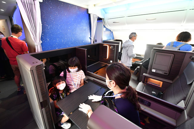 ANAのA380による「レストランFLYING HONU」の機内見学会が開かれた初号機でファーストクラスを体験する参加者=21年6月26日 PHOTO: Tadayuki YOSHIKAWA/Aviation Wire