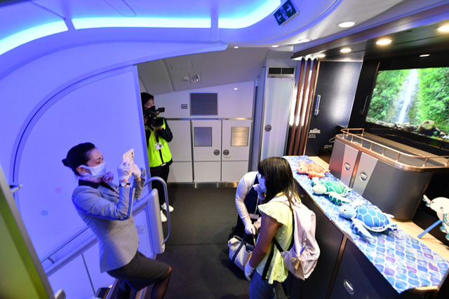 ANAのA380による「レストランFLYING HONU」の機内見学会が開かれた初号機=21年6月26日 PHOTO: Tadayuki YOSHIKAWA/Aviation Wire