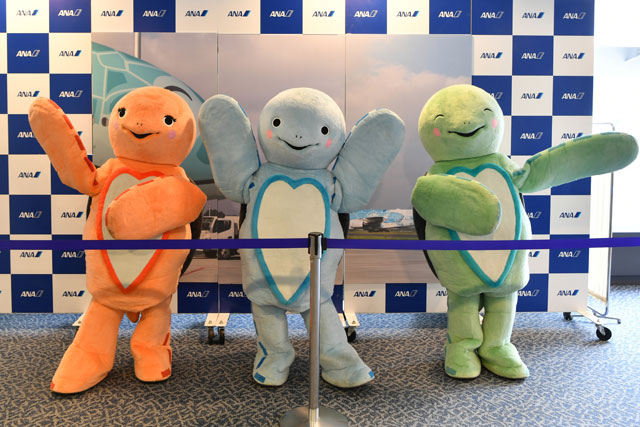 機内食を堪能した参加者が降機後、連絡バスでターミナルへ戻ると、A380とウミガメをモチーフにしたANAのオリジナルキャラクター、ブルーの「ラニ(lani)」、グリーンの「カイ(kai)」、オレンジの「ラー(la)」が出迎え、記念撮影の場を設けていた。ANAによると、これらの名前はキャラクターのもので、3機のA380の愛称ではない。