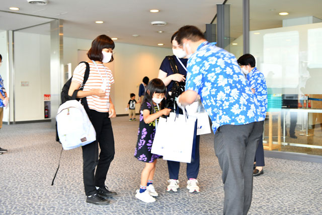成田空港のターミナルへ戻った「レストランFLYING HONU」の参加者におみやげを手渡すANAの社員=21年6月26日 PHOTO: Tadayuki YOSHIKAWA/Aviation Wire