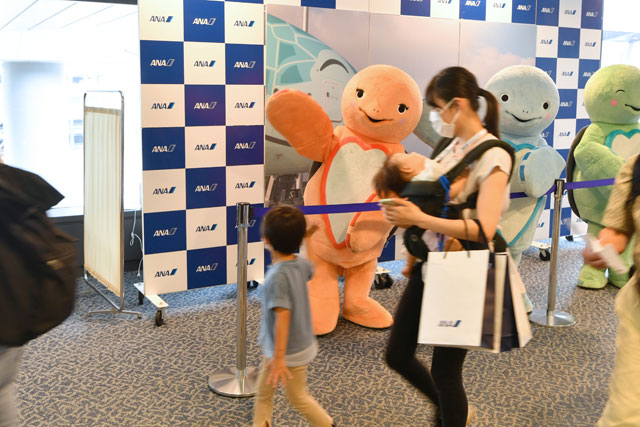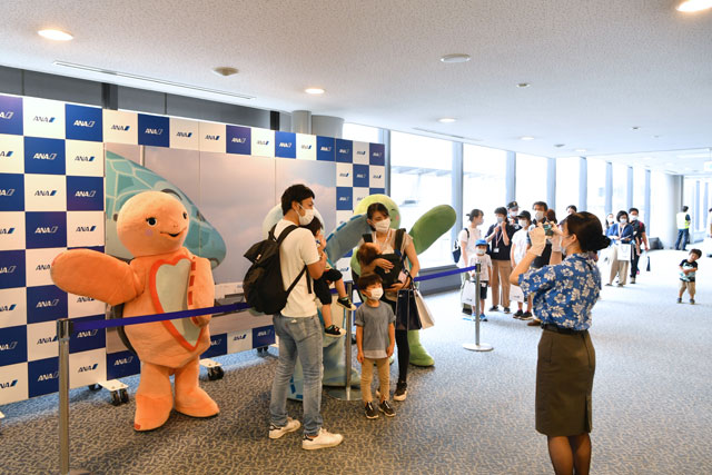 成田空港のターミナルでANAのオリジナルキャラクターのラーらに見送られる「レストランFLYING HONU」の参加者=21年6月26日 PHOTO: Tadayuki YOSHIKAWA/Aviation Wire