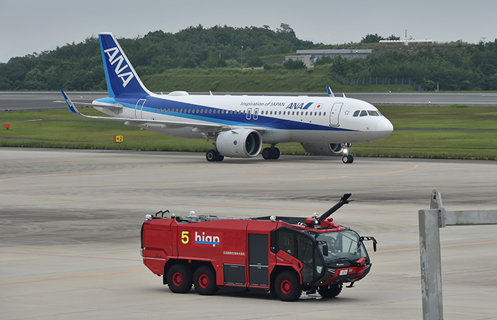広島空港へ到着する民営化開始の到着初便となったANAの羽田発NH671便=21年7月1日 PHOTO: Yusuke KOHASE/Aviation Wire