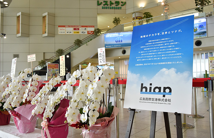 国内線保安検査場入り口に設置した広島空港民営化開始をアピールする看板=21年7月1日 PHOTO: Yusuke KOHASE/Aviation Wire