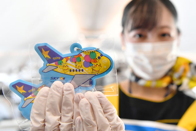 ピカチュウジェットBCの機内で子供に手渡すスポンジキーホルダーを手にするスカイマークの客室乗務員=21年6月21日 PHOTO: Tadayuki YOSHIKAWA/Aviation Wire