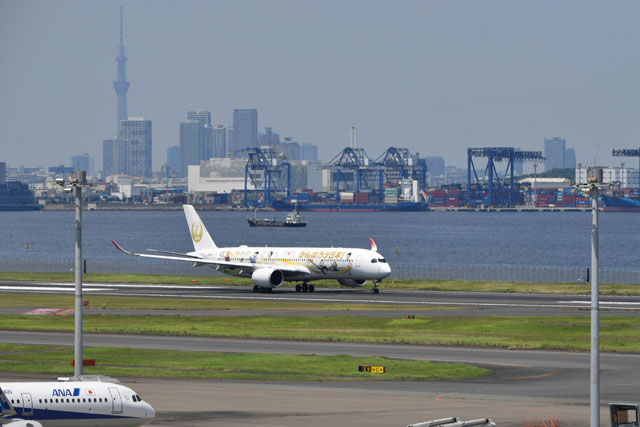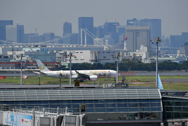 羽田空港のC滑走路へ向かう垂直尾翼が金の鶴丸になった「みんなのJAL2020ジェット」3号機初便の札幌行きJL515便=21年7月20日 PHOTO: Tadayuki YOSHIKAWA/Aviation Wire