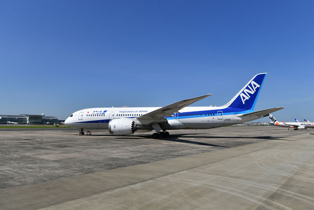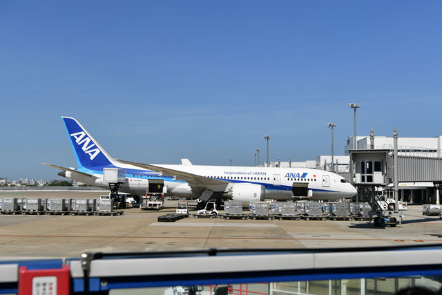 西鉄の「福岡オープントップバス」で巡る福岡空港の制限エリア内から見た国内線ターミナルに駐機中のANAの787=21年10月5日 PHOTO: Tadayuki YOSHIKAWA/Aviation Wire