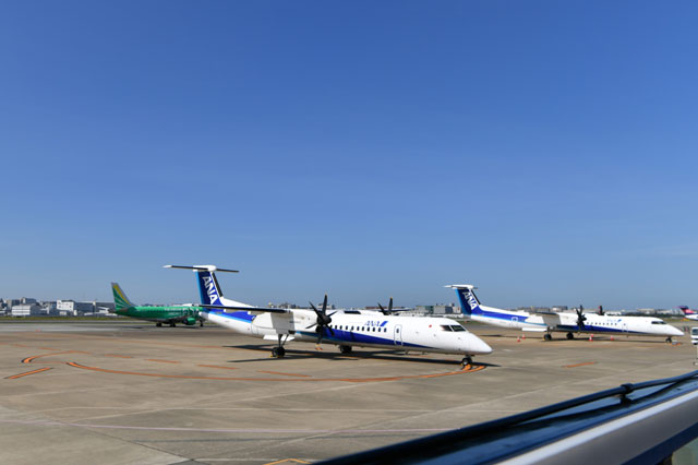 西鉄の「福岡オープントップバス」で巡る福岡空港の制限エリア内から見た駐機中のANAのQ400=21年10月5日 PHOTO: Tadayuki YOSHIKAWA/Aviation Wire