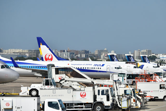 西鉄の「福岡オープントップバス」で巡る福岡空港の制限エリア内から見た駐機中の旅客機=21年10月5日 PHOTO: Tadayuki YOSHIKAWA/Aviation Wire