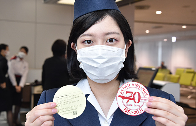 JALの羽田-札幌線70周年を記念して制作した記念ロゴと配布したメッセージカード=21年10月26日 PHOTO: Yusuke KOHASE/Aviation Wire