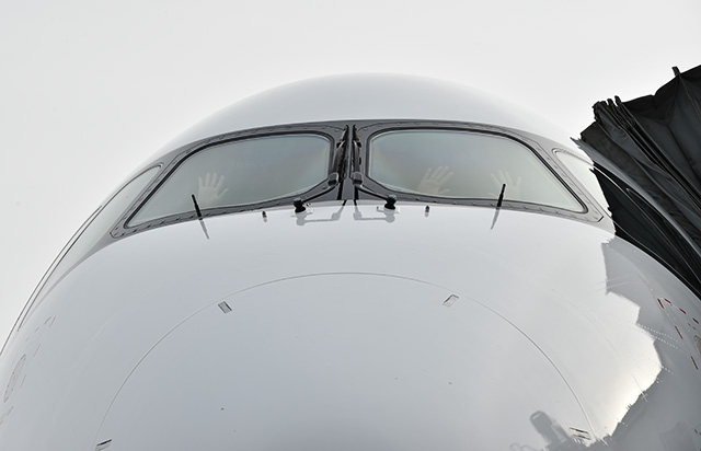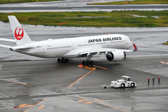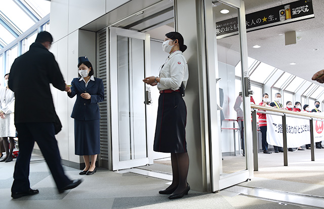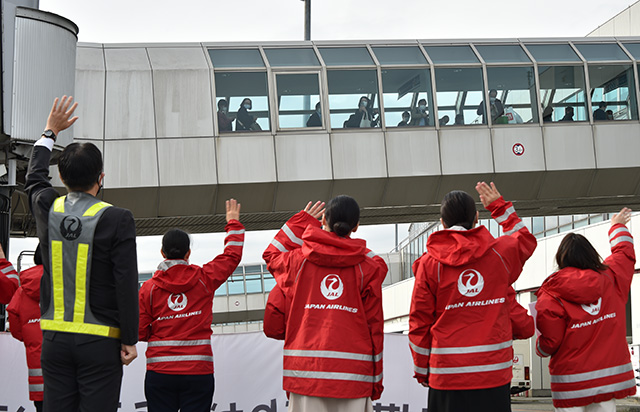 横断幕を掲出し新千歳発羽田行きJL500便を見送るJALのスタッフ=21年10月26日 PHOTO: Yusuke KOHASE/Aviation Wire