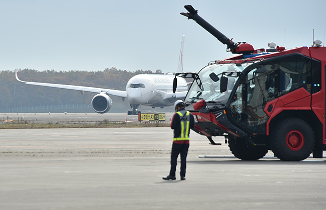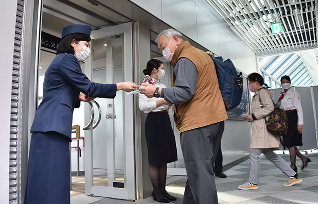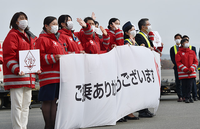 日本航空(JAL/JL、9201)の羽田-札幌(新千歳)線が10月26日、就航70周年を迎えた。26日の新千歳空港の発着1便目を記念便として運航し、就航当時に着用していた客室乗務員の初代制服を着た社員らが横断幕を掲出するなどで、利用客に謝意を表した。