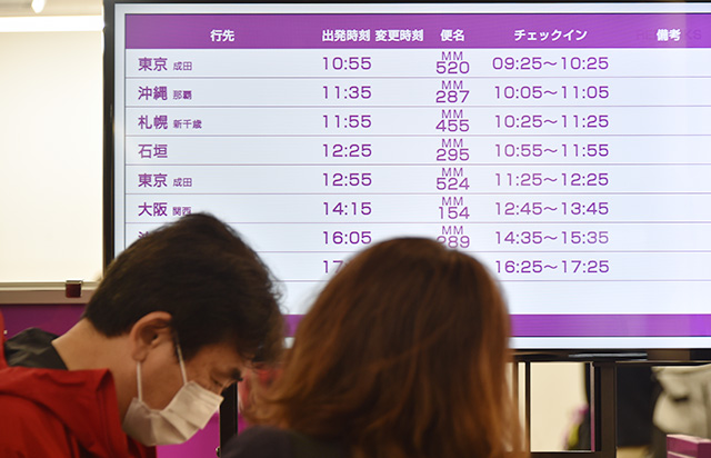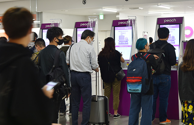 福岡空港でピーチの石垣行きMM295便初便などへの搭乗手続きを進める利用客=21年10月31日 PHOTO: Yusuke KOHASE/Aviation Wire