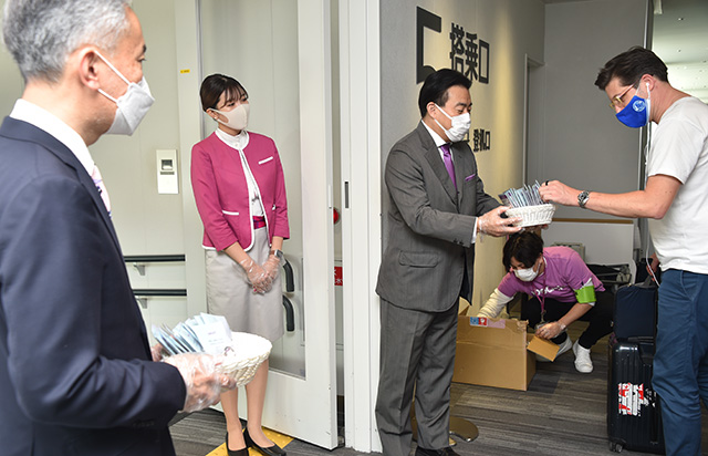 石垣行きMM295便初便の乗客に記念品を配布するピーチの森CEO(右から2人目)ら=21年10月31日 PHOTO: Yusuke KOHASE/Aviation Wire