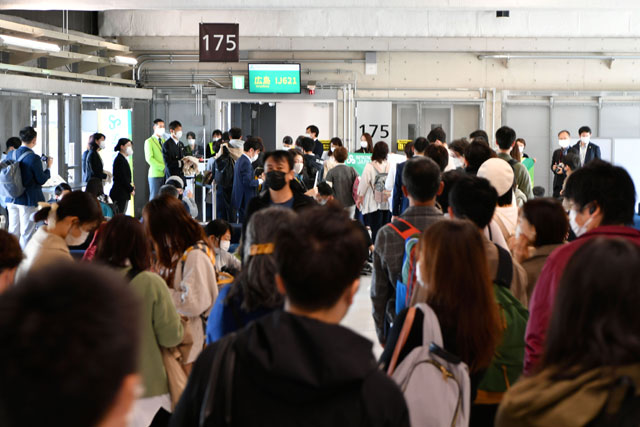 成田空港でスプリング・ジャパンの広島行きIJ621便に搭乗する乗客=21年11月6日 PHOTO: Tadayuki YOSHIKAWA/Aviation Wire