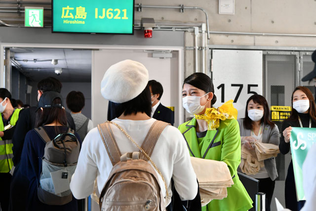 社名変更後最初の国内線運航日に成田空港でスプリング・ジャパンの広島行きIJ621便の乗客に記念品を手渡す客室乗務員=21年11月6日 PHOTO: Tadayuki YOSHIKAWA/Aviation Wire