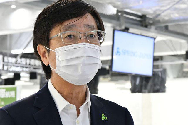 成田空港で取財に応じるスプリング・ジャパンの米澤章社長=21年11月6日 PHOTO: Tadayuki YOSHIKAWA/Aviation Wire