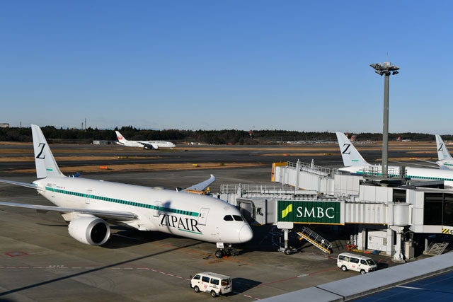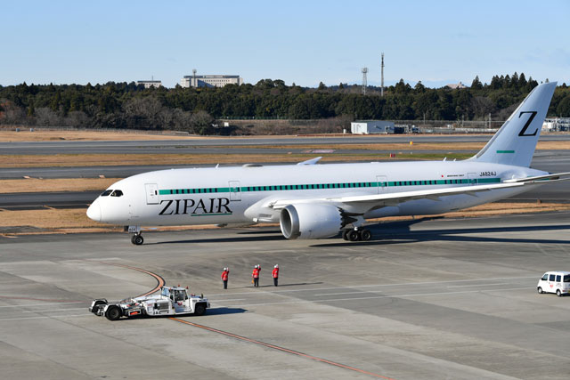 日本航空(JAL/JL、9201)が100%出資する中長距離LCCのZIPAIR(ジップエア、TZP/ZG)は12月18日、ボーイング787-8型機の3号機(登録記号JA824J)を就航させた。初便は成田発ソウル(仁川)行きZG41便で、乗客を乗せない貨物専用便として第1ターミナルの25番スポットから午前8時48分に出発し、A滑走路(RWY34L)を午前9時5分に離陸した。成田を出発する前には、全3機が並ぶ姿が見られた。