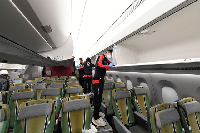 本写真特集では、5号機のCチェックの様子をまとめた。前編は胴体や主脚、主翼、エンジンなど機体の作業、今回の後編は客室を中心に取り上げる。