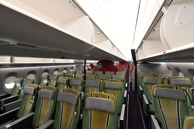 羽田空港の格納庫でCチェックを受けている5号機の客室は、シートの背もたれの布地が外され、整備作業と並行してオーバーヘッドビン(手荷物収納棚)の清掃作業も行われていた。普通席はダークグレーを基調とした布地だが、中の背もたれは赤色、ワインレッドのクラスJシートの中は緑色だった。