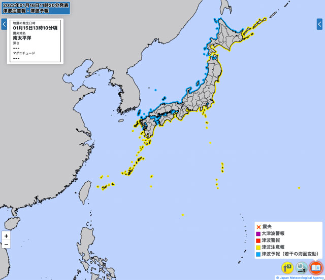 気象庁によると、トンガ諸島付近のフンガ・トンガ-フンガ・ハアパイ火山が日本時間1月15日午後1時ごろ大規模噴火を起こした。16日午前11時20分の発表で、北海道から沖縄までの太平洋沿岸部に津波注意報が出ている。