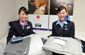 国際線ファースト(左)とビジネスの寝具を紹介するANAの客室乗務員=8月8日 PHOTO: Tadayuki YOSHIKAWA/Aviation Wire