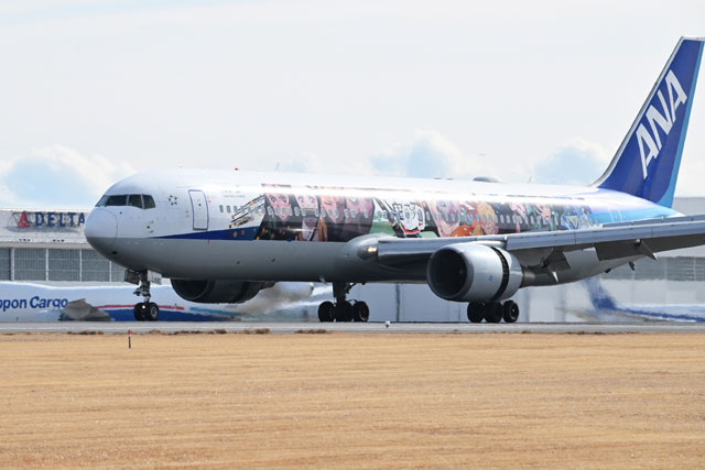 成田空港に到着したANAの特別デザイン機「鬼滅の刃じぇっと -壱-」=22年1月30日 PHOTO: Tadayuki YOSHIKAWA/Aviation Wire