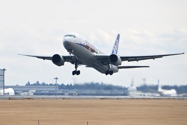 成田空港を離陸するANAの特別デザイン機「鬼滅の刃じぇっと -壱-」による遊覧チャーター=22年1月30日 PHOTO: Tadayuki YOSHIKAWA/Aviation Wire