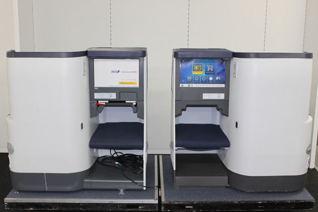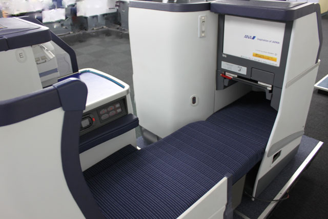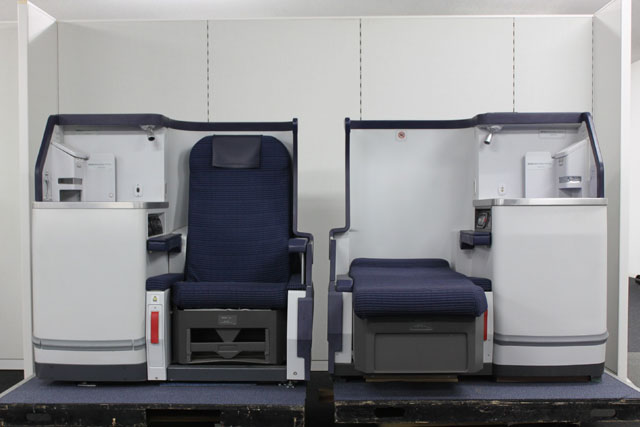 国際線ビジネスクラスのモックアップは、2010年4月に日本で初めてビジネスクラスに全席通路アクセス可能な互い違いの「スタッガード配列」を採用したシートで、実機では長距離国際線機材であるボーイング777-300ER型機に搭載。「シートポジションタイプ」とシートをフルフラットに倒した「ベッドポジションタイプ」のセットで、前にシートポジションタイプ、後ろにベッドポジションタイプを配置すると、シートポジションタイプ背面のオットマン部分とベッドポジションタイプのシートを連ねて、ベッドとして使用できる。