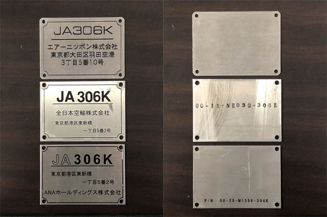 JA306Kの機体識別板は、2020年7月29日に国土交通省航空局(JCAB)の登録が抹消された機体のもので、ANAの社内に現存する所有者がエアーニッポン(ANK)時代、ANA時代、ANAホールディングス所有でANAウイングス運航時代の3点セット。入札開始価格は税込737円。