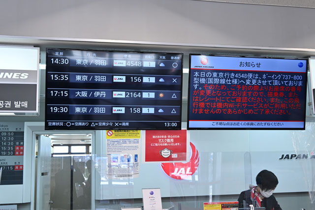 JALの羽田-三沢線は1日3往復だったが、2020年5月に審査結果が発表された政策コンテストで、羽田発着枠が1枠配分されたことから1往復増便。現在は臨時便を除くと1日4往復運航している。機材はボーイング737-800型機(2クラス165席)と、グループのジェイエア(JAR/XM)が運航するエンブラエル190(E190、2クラス95席)型機を投入している。