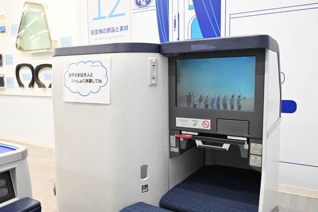 ANAの新機体工場見学「ANA Blue Hangar Tour」で新たに加わる体験型施設に設置されたビジネスクラスシート=22年3月28日 PHOTO: Tadayuki YOSHIKAWA/Aviation Wire