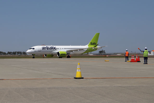 仙台空港に到着したエア・バルティックのA220-300(仙台国際空港会社提供)