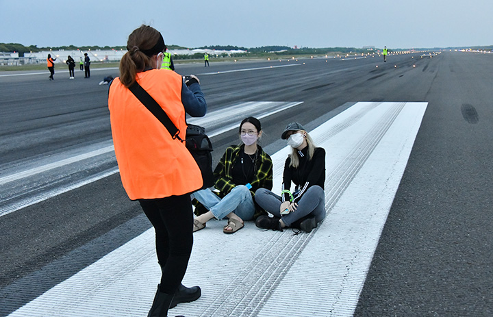 成田空港のA滑走路に座り撮影するツアー参加者=22年5月21日 PHOTO: Yusuke KOHASE/Aviation Wire