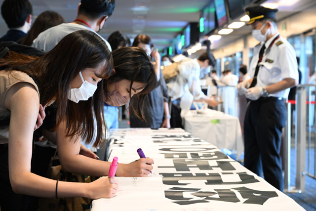 羽田空港の搭乗口前で横断幕に寄せ書きするJALの787就航10周年チャーター参加者=22年5月28日 PHOTO: Tadayuki YOSHIKAWA/Aviation Wire