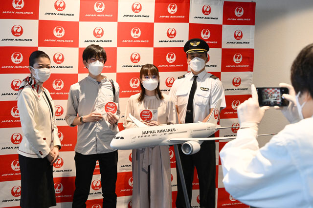 羽田空港の搭乗口前でJALの787初便に乗務した福本機長(右)と﨑田CA(左)とともに記念撮影する就航10周年チャーター参加者=22年5月28日 PHOTO: Tadayuki YOSHIKAWA/Aviation Wire