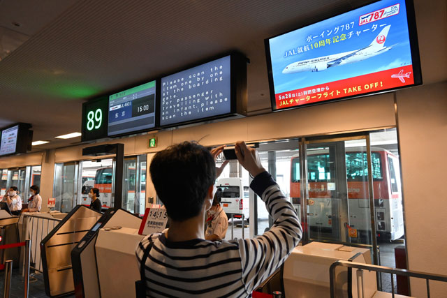 羽田空港の搭乗口前でJALの787就航10周年チャーターの案内表示を撮影する参加者=22年5月28日 PHOTO: Tadayuki YOSHIKAWA/Aviation Wire