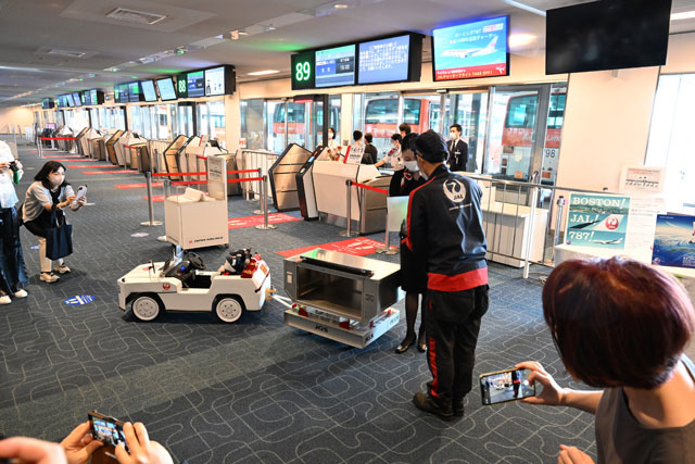 羽田空港の搭乗口前にJALの787就航10周年チャーターの参加者にポストカードを届けるJGSの「おもちゃTT車」=22年5月28日 PHOTO: Tadayuki YOSHIKAWA/Aviation Wire