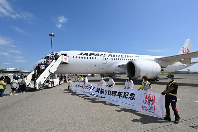 日本航空(JAL/JL、9201)は5月28日、ボーイング787型機の就航10周年を記念したチャーター便(787-8、登録記号JA837J)を羽田発着で運航した。機内では10年前のボストン行き初便に乗務したパイロットと客室乗務員が当時の様子を振り返り、787に関するクイズ大会が開かれた。