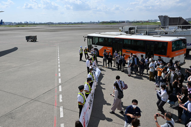 チャーター便のJL4901便は参加者172人とスタッフを乗せ、羽田空港の40番スポットを午後2時54分に出発した。PBB(搭乗橋)のない「オープンスポット」からの出発のため、搭乗前には多くの参加者が機体やスタッフと記念撮影していた。