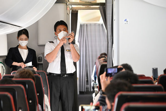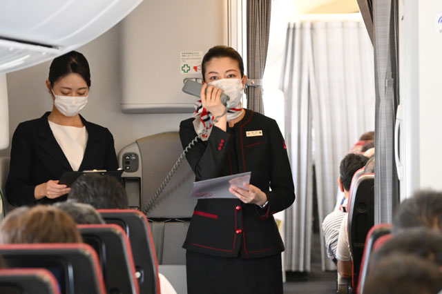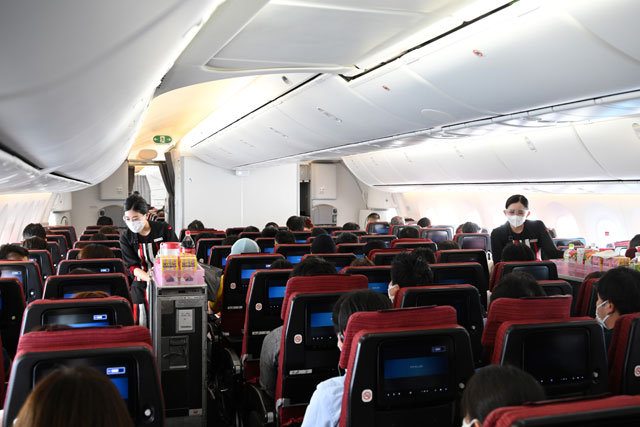 JALの787就航10周年チャーター便で機内サービスする客室乗務員=22年5月28日 PHOTO: Tadayuki YOSHIKAWA/Aviation Wire