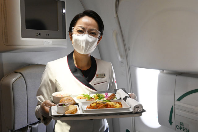 JALの787就航10周年チャーター便のビジネスクラスで提供する機内食を手にする丸山CA=22年5月28日 PHOTO: Tadayuki YOSHIKAWA/Aviation Wire