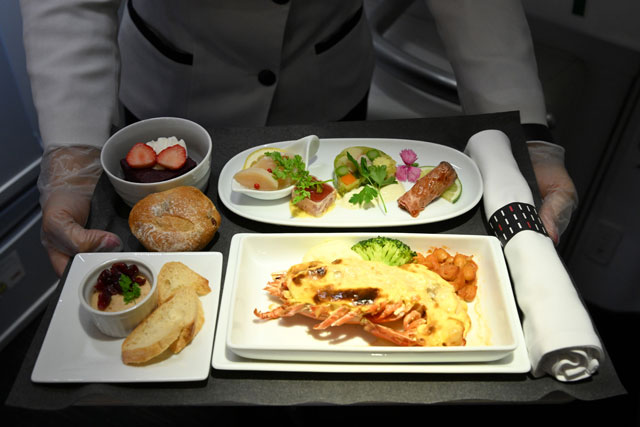 ビジネスクラスの機内食はボストン線初便のメニューを再現した「オマール海老のテルミドール」、エコノミークラスはクランベリーを使ったスイーツなど、ボストンにちなんだメニューを用意した。