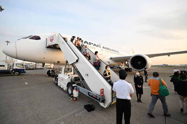 羽田空港に帰着したJALの787就航10周年チャーター便から降機する参加者=22年5月28日 PHOTO: Tadayuki YOSHIKAWA/Aviation Wire