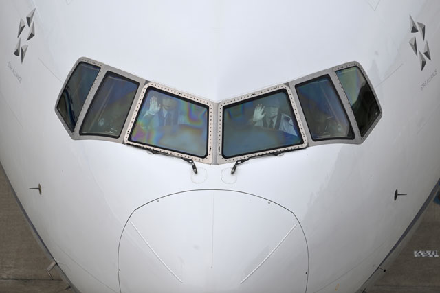 羽田第2ターミナルの展望デッキに集まった人にコックピットから手を振るANAのPW4000搭載777再開初便の福岡行きNH255便のパイロット=22年6月23日 PHOTO: Tadayuki YOSHIKAWA/Aviation Wire