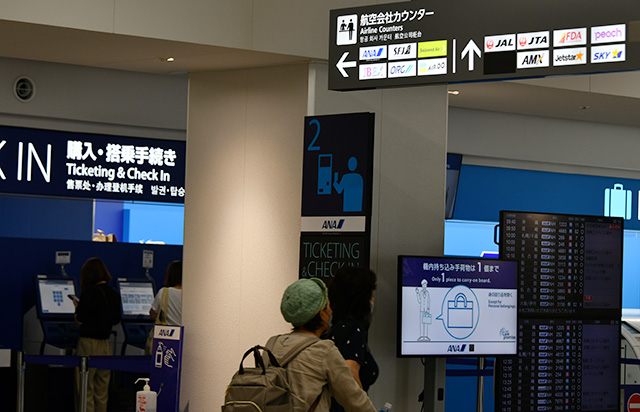 エア・ドゥのカウンター位置を示す福岡空港の看板=22年7月1日 PHOTO: Yusuke KOHASE/Aviation Wire