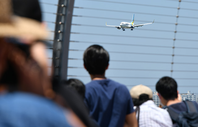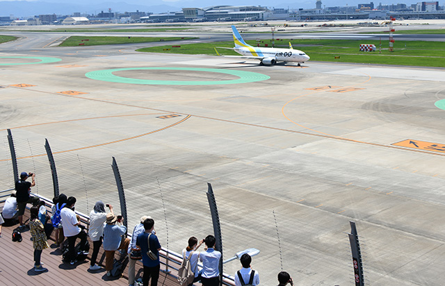 就航当日の福岡空港は30度を上回る真夏日となったものの、デッキには「北海道の翼」を一目見ようと多くの航空ファンが詰めかけた。